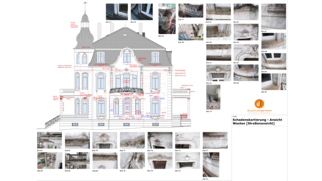 Eine detaillierte Betrachtung des Gebäudes oder Bauteils auf Schäden, wie zum Beispiel Risse im Putz oder Steinschäden, ermöglicht uns, eine realistische Kostenberechnung zu erstellen und im Kopf und auf dem Plan ein umfassendes Schadensbild entstehen zu lassen.