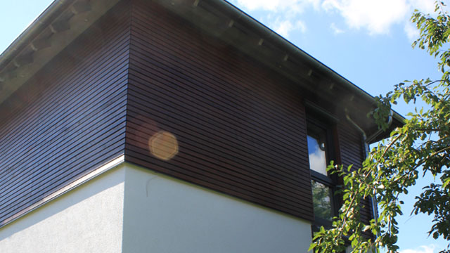 Die Ausführung des Erdgeschosses ist massiv, der Aufbau im Obergeschoss erfolgte in Holzrahmenbauweise, verkleidet mit einer verleisteten Fassadenschalung aus Holz.