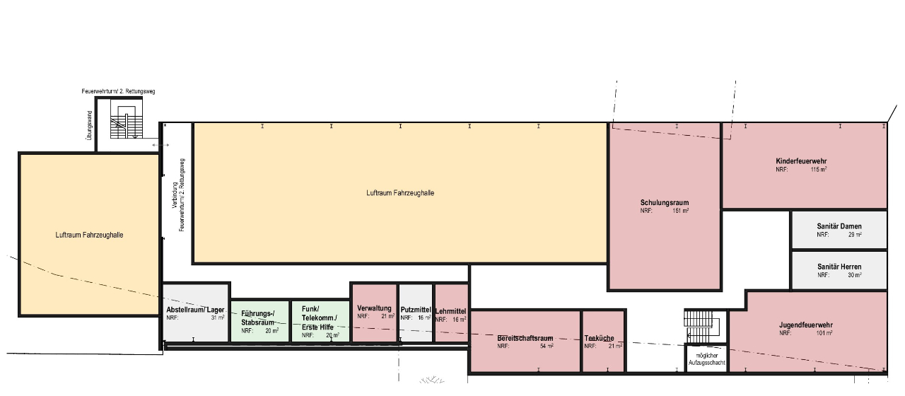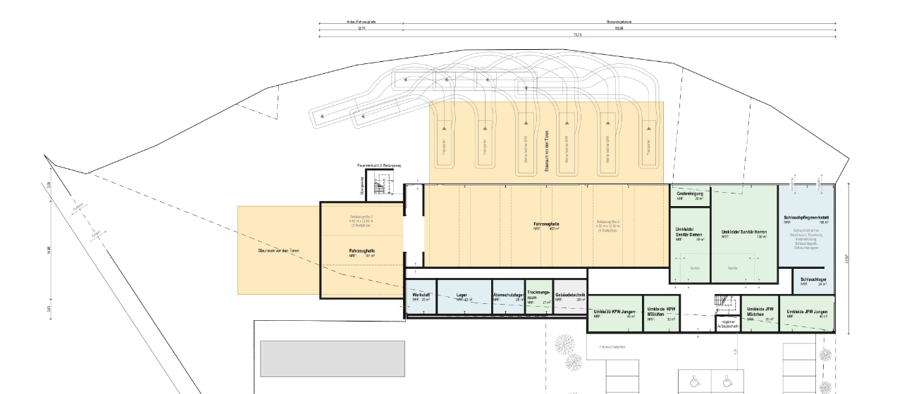Im Erdgeschoss befinden sich die Fahrzeughalle, Werkstätten, Lagerräume und Räume für die Einsatz- und Übungsabwicklung. Weitere Räume für die Einsatz- und Übungsabwicklung sowie Räume für die Ausbildung, Aufenthalt und Verwaltung befinden sich im Obergeschoss. Eine weitere Fahrzeughalle mit 3 Stellplätze wird an die bestehende Halle angebaut. Es entsteht ein Feuerwehrturm, der zu Übungszwecken und als 2. Rettungsweg aus dem Obergeschoss dient. Eine zweite Lagerhalle wird zurückgebaut, um ausreichend Fahrrad- und Pkw-Stellplätze für die Einsatzkräfte zu schaffen. So ist auch gewährleistet, dass die Ein- und Ausfahrt des Parkplatzes von der Alarmausfahrt getrennt ist.
