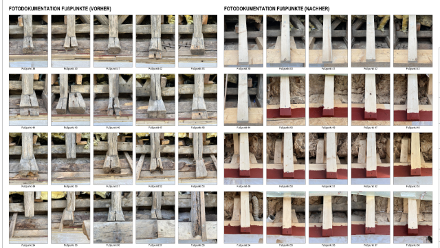 Um weitere Folgeschäden wie statische Absenkungen und Fäulnisbildungen, die auch die wertvollen Stuckdecken im Gebäudeinneren weiter angreifen könnten, zu vermeiden, wurde eine Schadenskartierung erstellt und Abschnittsweise die dringend notwendigen Sanierungsmaßnahmen an den Fußpunkten durchgeführt.